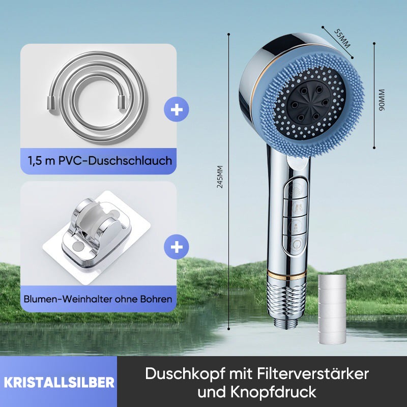 Dieses CE-zertifizierte Ailin-Handbrause-Set bietet ein hochfunktionales 4-in-1-Erlebnis – von der luxuriösen Turbodruck-Massage bis hin zur integrierten Reinigungsbürste – und das alles in einem eleganten, einfach zu installierenden Design.